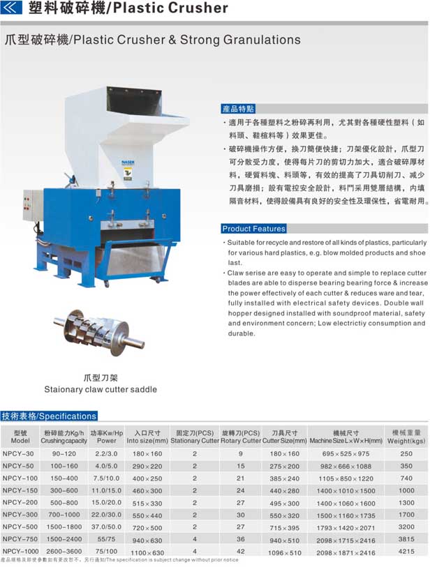 適用于各種逆料之粉碎再利用,尤其對(duì)各類硬性塑料(如料頭,鞋楦料等)效果更佳。NPCY系列破碎機(jī)操作方便,換刀簡(jiǎn)便快捷;刀架優(yōu)化設(shè)計(jì),爪型刀可分散受力度,便得每片刀和剪切力加大,適合破碎厚材料,硬質(zhì)料塊,料頭等,有效的提高了刀具切削力,減少刀具磨損;設(shè)有電控按全設(shè)計(jì),料頭采用雙層結(jié)構(gòu),內(nèi)填隔音材料,使得設(shè)備具有良好的安全性及環(huán)保性,省電耐用。